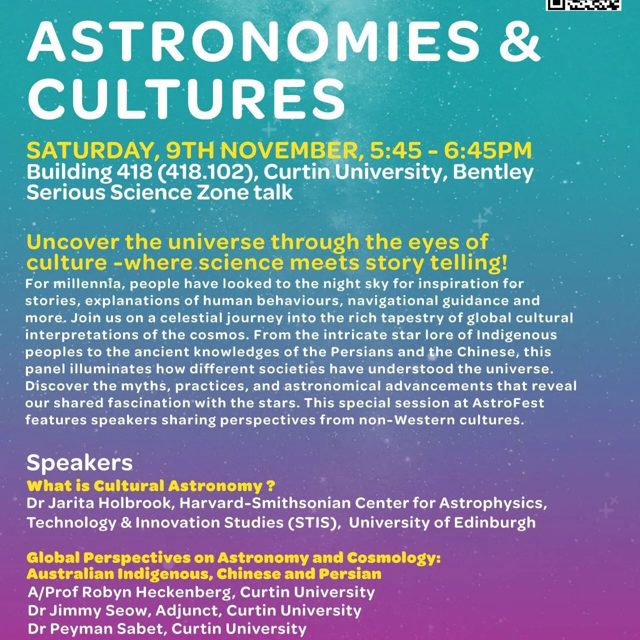 The stars have fascinated humanity for millennia. From stories to scientific discoveries, cultures worldwide have looked to the night sky to make sense of the universe and to understand their place within it. This year’s Astrofest brings that legacy to life with a unique session titled Cultural Astronomy and Global Perspectives on Astronomy and Cosmology. Join us on Saturday, 9 November, from 5:45 PM to 6:45 PM in the Serious Science Zone (Building 418.102) for an evening where science and storytelling meet, revealing the cosmic traditions of cultures from around the globe.