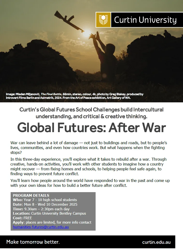 Curtin University is excited to announce the Global Futures High School Challenge: After War, a thought-provoking 3-day event designed for Year 7–10 students. This immersive experience invites students to explore the global consequences of conflict and the possibilities for peacebuilding, resilience, and renewal in postwar societies.