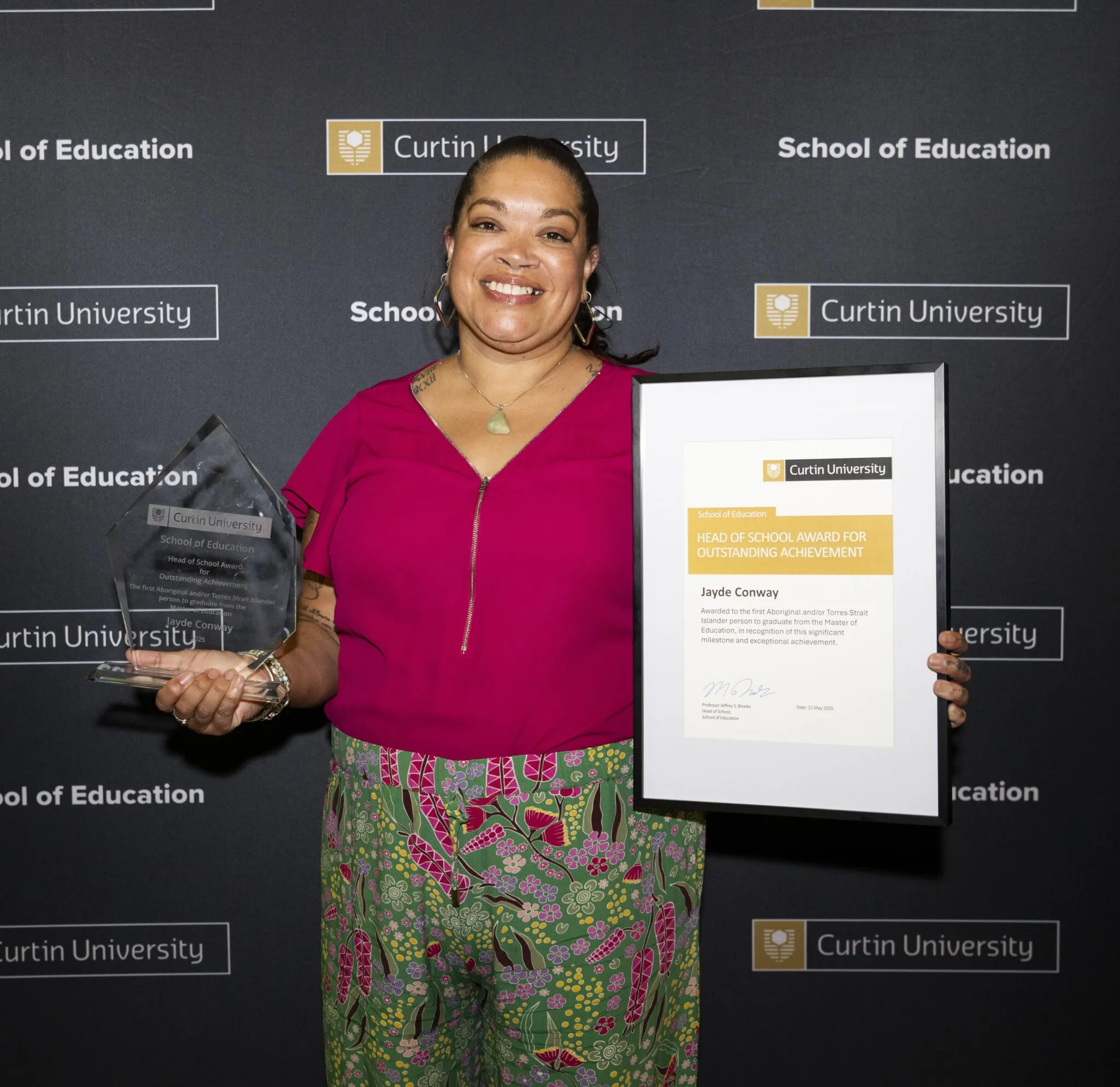 In February 2025, Jayde Conway made history at Curtin University. She became the first Indigenous graduate from the School of Education to complete a Master of Education since the School opened in 1975.