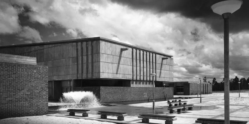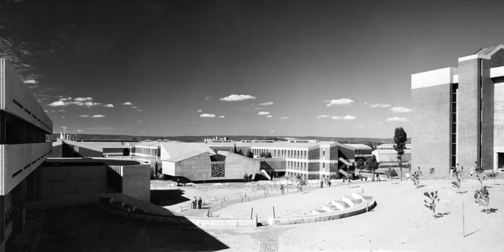 The fire burnt out a large section of the Collier Pine Plantation in Bentley, 6 km south of Perth. This fortuitous event, coupled with the unsuitability of other potential sites, led to Bentley’s selection in 1962. Vin Davies, a Public Works Department architect, was chosen to design the initial buildings and work began in earnest. Davies’ signature style, using bricks and off-form concrete, set the tone for future building designs and is still evident on campus today.