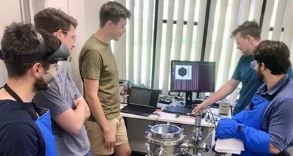 Stuart Buchan (centre) and members of the team testing the satellite in a vacuum chamber.