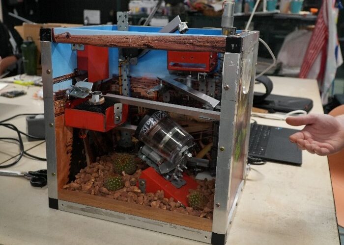 After many hard and long hours of work, the teams set up their machines in the Library Makerspace for grading. Each group was assessed on timing, hardware / software / mechanical complexity, use of recycled materials, aesthetics, and more. The winning “Crazy Machine” was developed by student engineers Thomas Howlett and Angus Watson, with an impressive mining-style contraption (pictured).